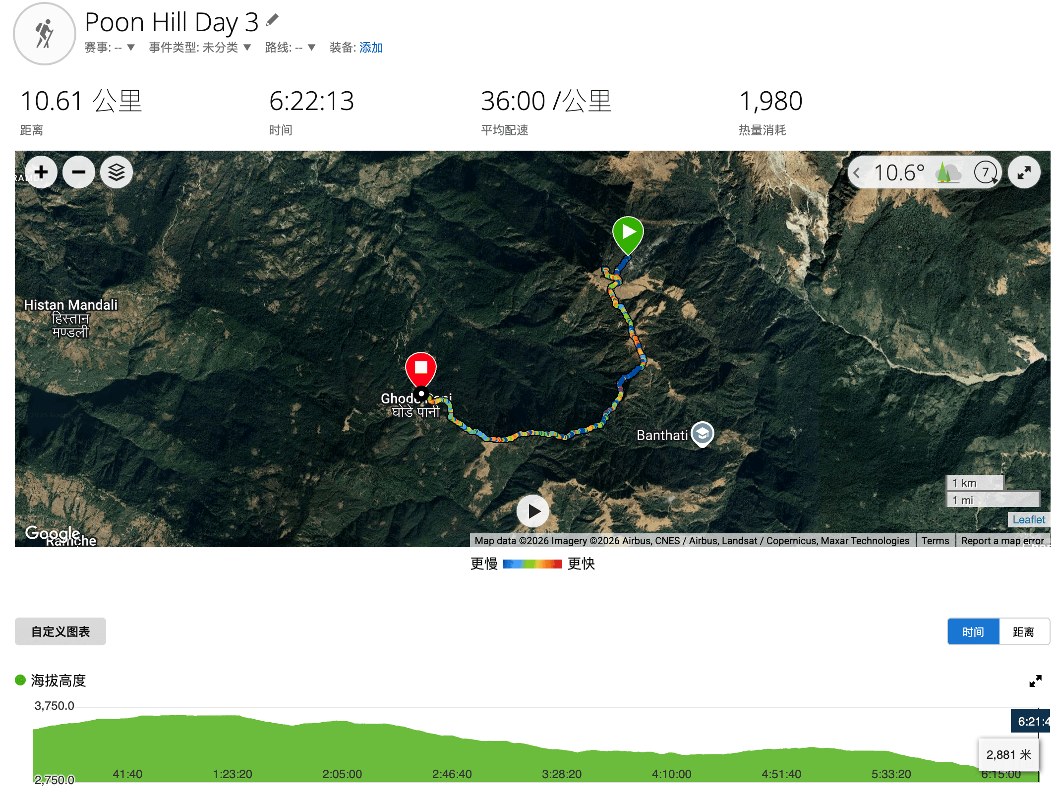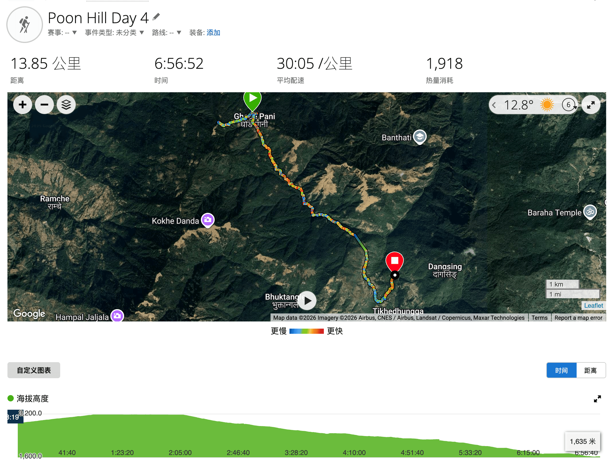 第一天的路程主要以爬升为主。从 Ghandruk 到 Tadapani,累计爬升 1116 米,下降 112 米,住宿海拔 2718 米。
